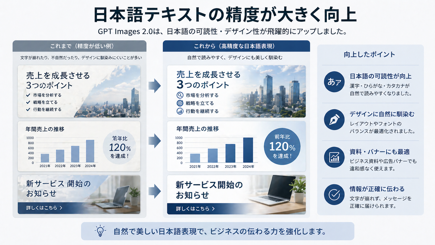 これらの課題を、GPT Images 2.0は一気に解消してきました。「アーティスト向け」から「ビジネス・マーケター向け」に、根本的な方針転換をしたモデルだと言っていいと思います。