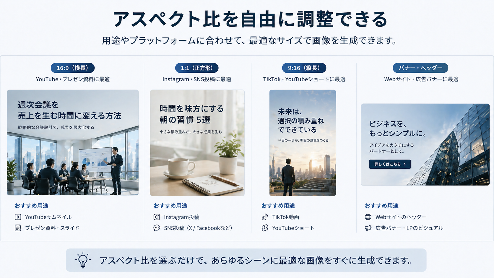 地味だけど大きいのが、アスペクト比を自由に指定できるようになったこと。正方形(1:1)、横長(16:9)、縦長(9:16)、SNSやブログのフォーマットに合わせて、最適なサイズで出力できます。